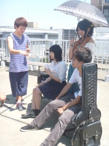 日傘も使用しながら、俳優科の学生が日焼けしないように気遣いも撮影現場では